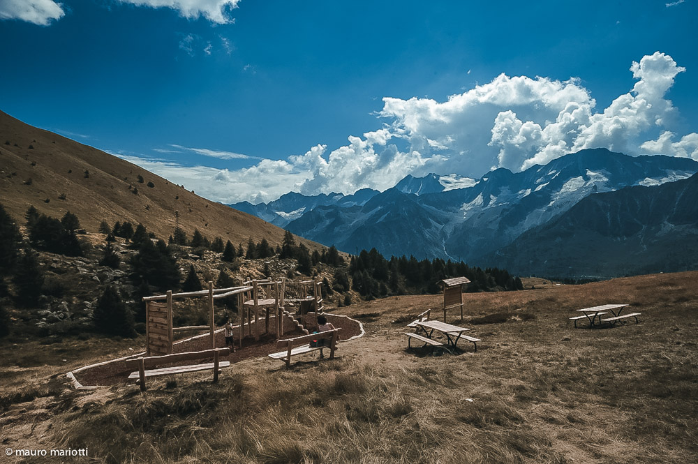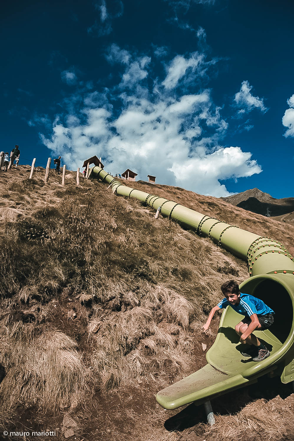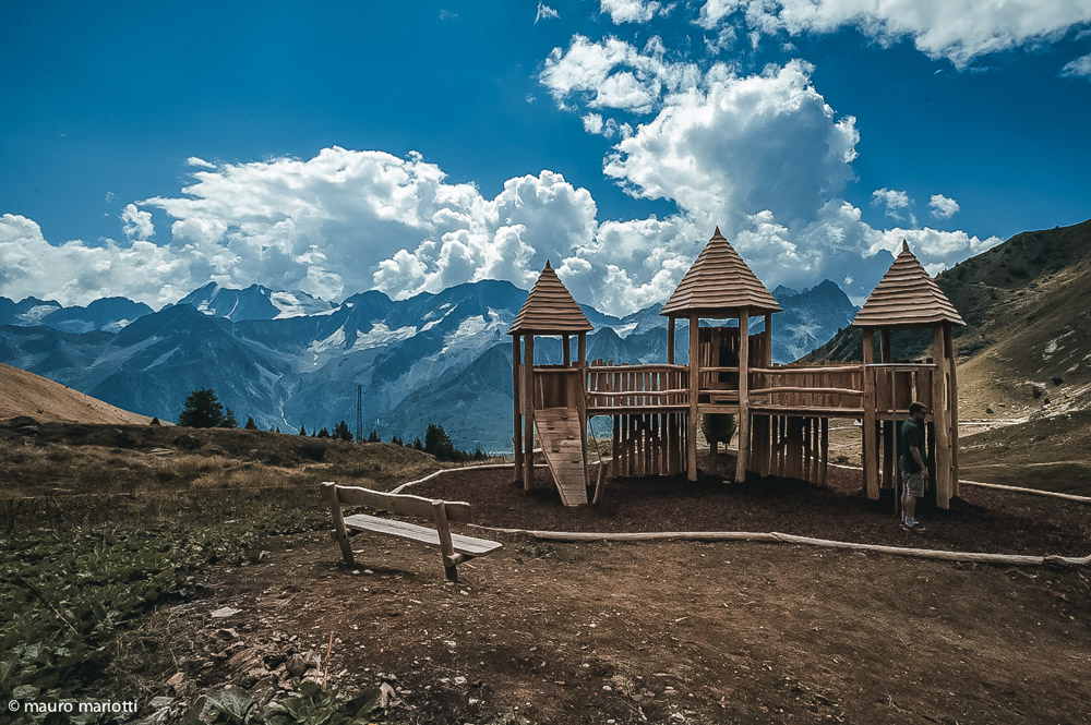 It is not a simple playground but rather a route with 5 different stations where children can have fun with slides, wooden houses, a tunnel similar to those that connect marmot dens and finally a watermill that can be operated by hand using an auger.