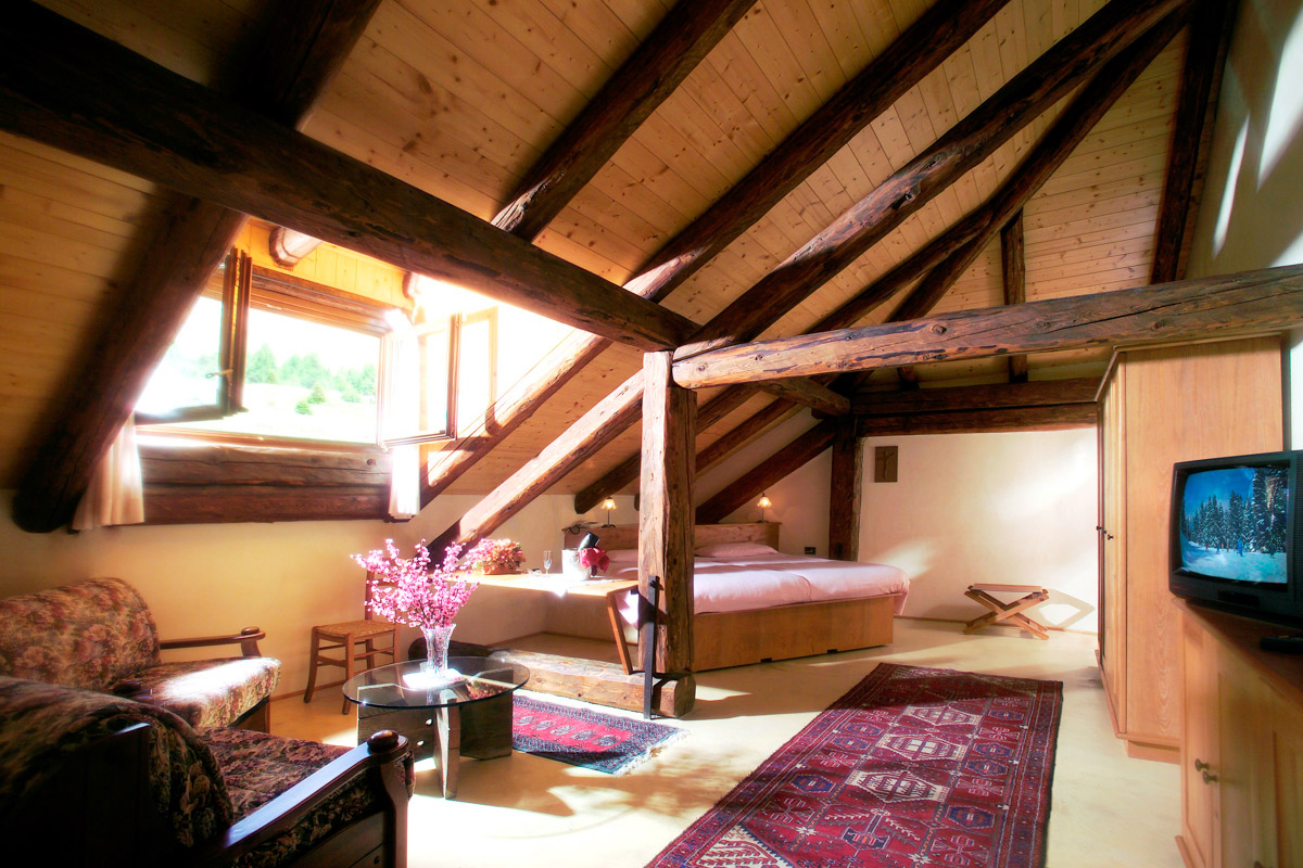 Each room is unique, furnished with care, wooden ceilings with exposed beams, bright windows which gaze out over the spectacular scene of the peaks in their Winter sleep.
