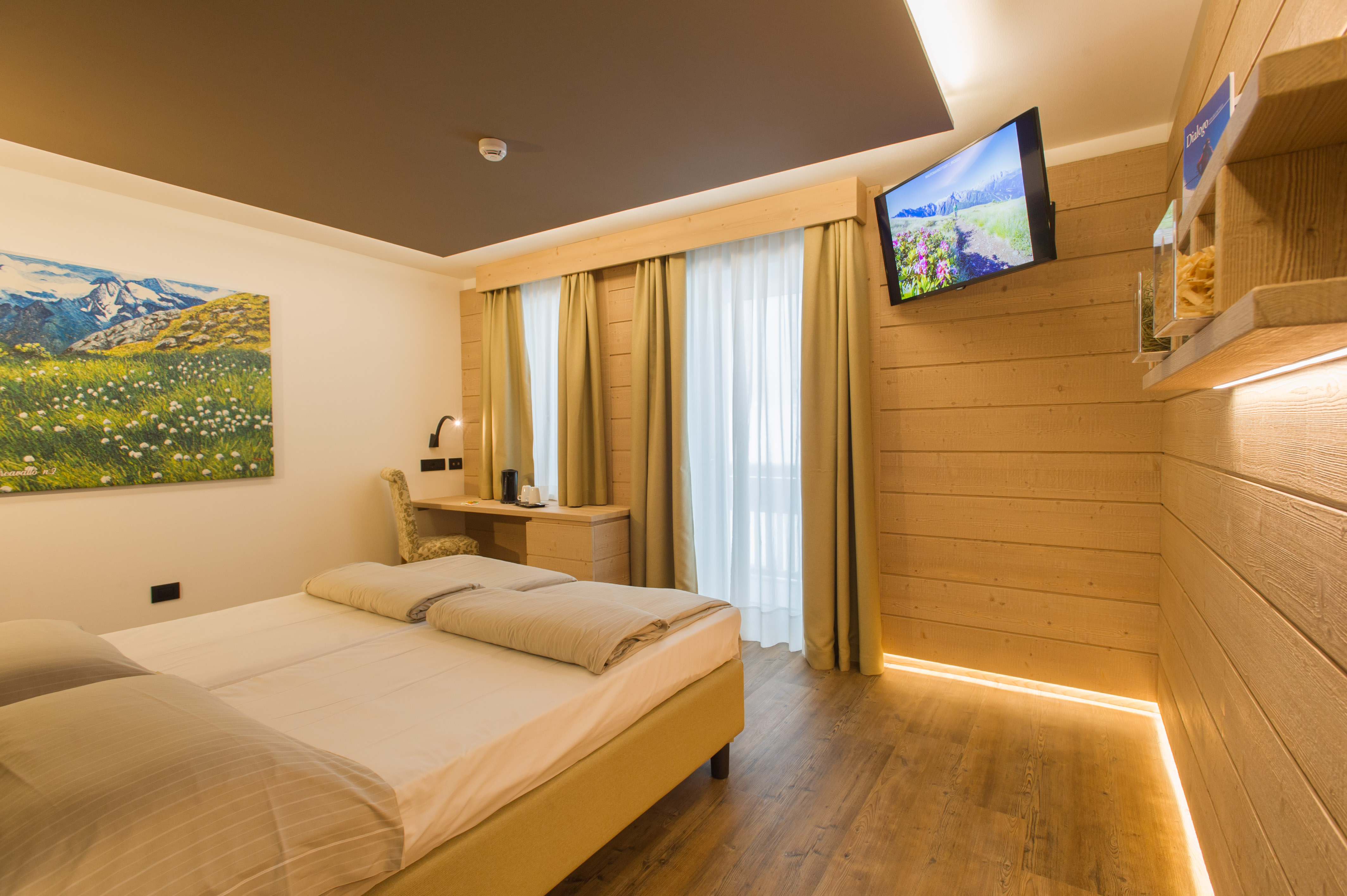 Le camere sono in stile montano, arredate in legno e tutte con vista sulle Alpi. Completano l’offerta altri piccoli servizi e la nostra celebre ospitalità fatta di 50 anni di esperienza.
