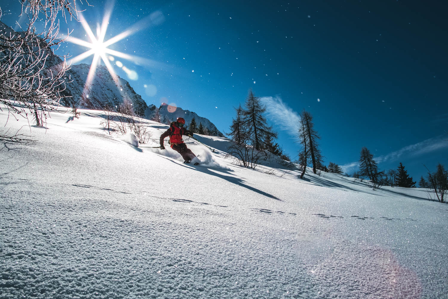 La massima espressione dello sci è quella di galleggiare sulla neve fresca. L’arte di sciare fuori dagli schemi, dai tracciati, dalle piste segnate e troppo battute. Boschi, pendii, valloni ricoperti da un soffice e candido manto nevoso.